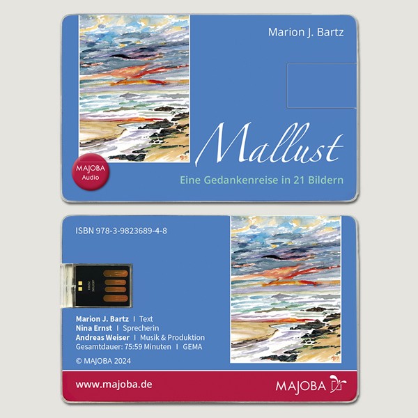 Das Hörbuch „Mallust – Eine Gedankenreise in 21 Bildern" basiert auf 21 Aquarellen und Geschichten, in denen sich die Berliner Malerin und Autorin Marion J. Bartz der Reiselust widmet – einem leidenschaftlichen Gefühl, das ihr ganzes Leben mitbestimmt hat. Das MAJOBA Audio Hörbuch, gesprochen von Nina Ernst und musikalisch umgesetzt von Andreas Weiser, ist Genuss und Inspiration.